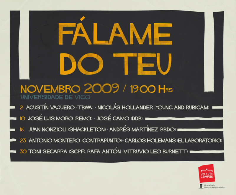 La primera de ellas será hoy, 2 de noviembre, a las 19:00 en la "Casa das Campás" Agustín Vaquero, director creativo TBWA Nicolás Hollander, director general creativo de Young&Rubicam España Modera: Marcos Dopico Castro