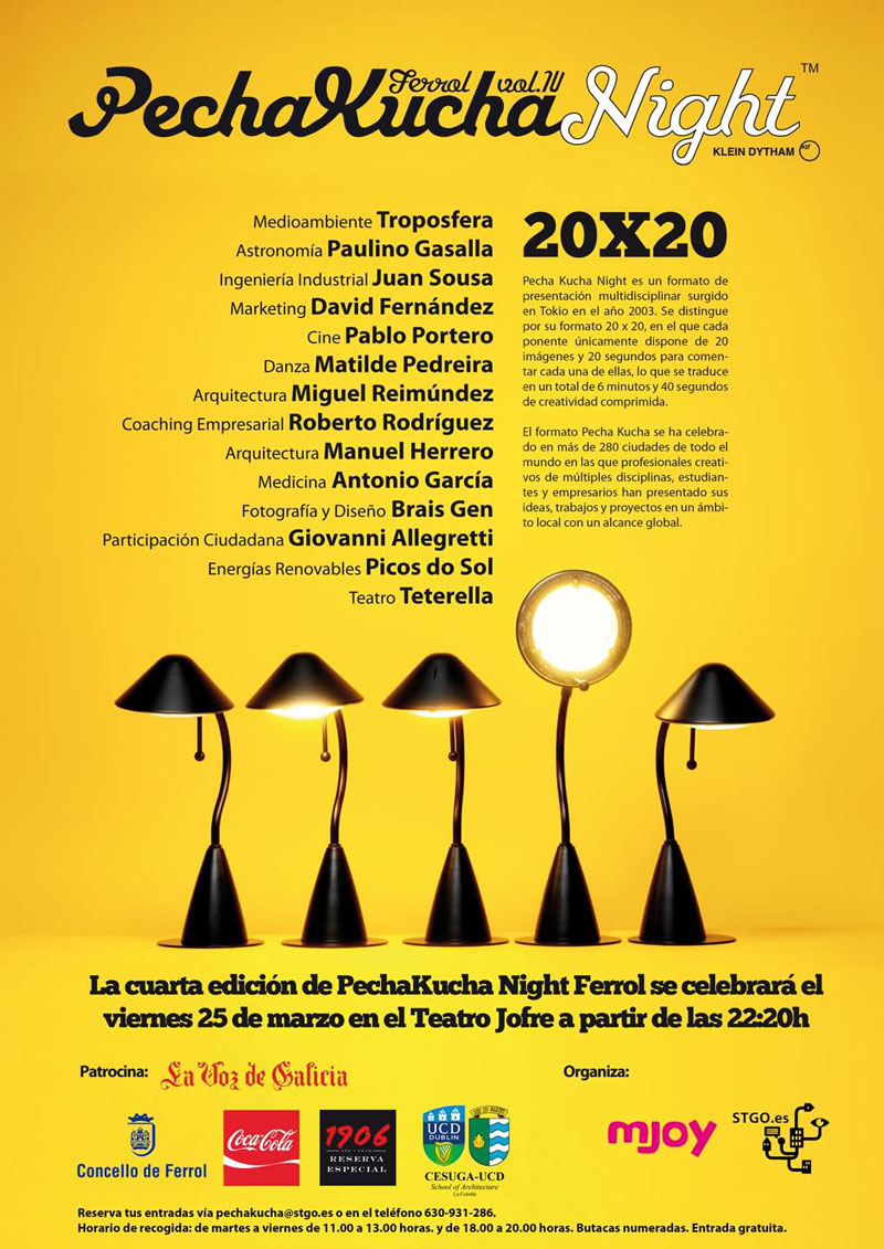 24-03-2011 15:15:22 IV PechaKucha Night Ferrol Twitter icon Twitter Facebook icon Facebook Día: 25 de marzo de 2011 Hora: 22.20 h Lugar: Teatro Jofre (Ferrol) Información y entradas