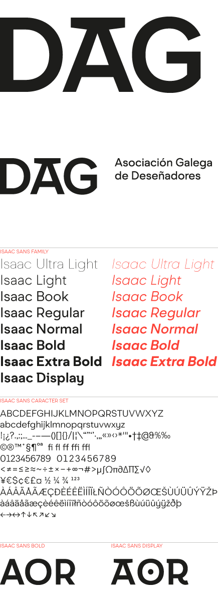 Para o resto de aplicacións corporativas usaranse as diferentes variantes da tipografía: Light, Book, Regular, Normal, Bold, e as súas correspondentes italicas. A Isaac Sans está dispoñible en formato Opentype - codificación Latin 1 - e WebFont para as aplicacións web.