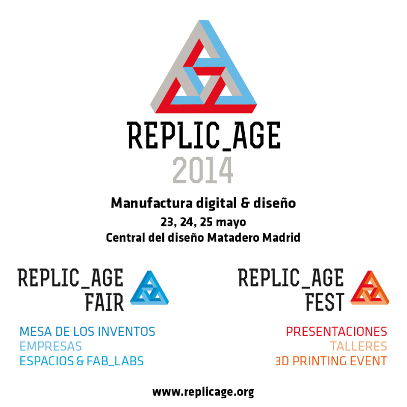 Entre o día 23 e o 25 de maio na Central do Deseño de Matadero de Madrid terá lugar REPLIC_AGE 2014, un multievento organizado por DIMAD e Makespace Madrid cuxas inquedanzas principais son a interacción entre deseñadores e comunidades makers, fab labs e produtores de maquinaria, software e servizos de manufactura dixital.