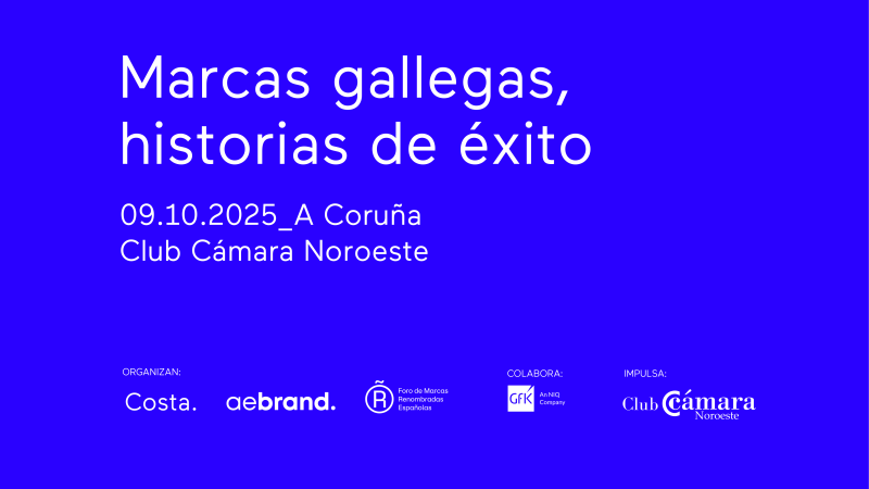 Esta iniciativa, organizada polo estudio do noso socio Dani Bembibre, Costa, en colaboración con Aebrand e o Foro de Marcas Renombradas Españolas, terá lugar mañá xoves 9 de outubro no Club Cámara Noroeste da Coruña, en horario de 9.30-14.30 h. O programa incluírá a presentación do BrandPulse 2024, informe de referencia sobre a saúde das marcas españolas.