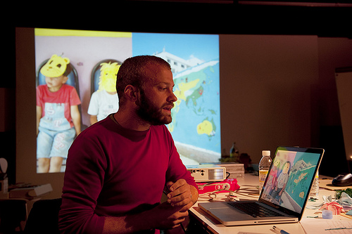 Nuno Coelho e Adam Kershaw presentaron a súa obra Uma terra sem gente para gente sem terra - Um livro de colorir sobre a Palestina e compartiron cos participantes do Taller de edición e xestión de revistas experimentais de La Más Bella a súa experiencia en autoedición.